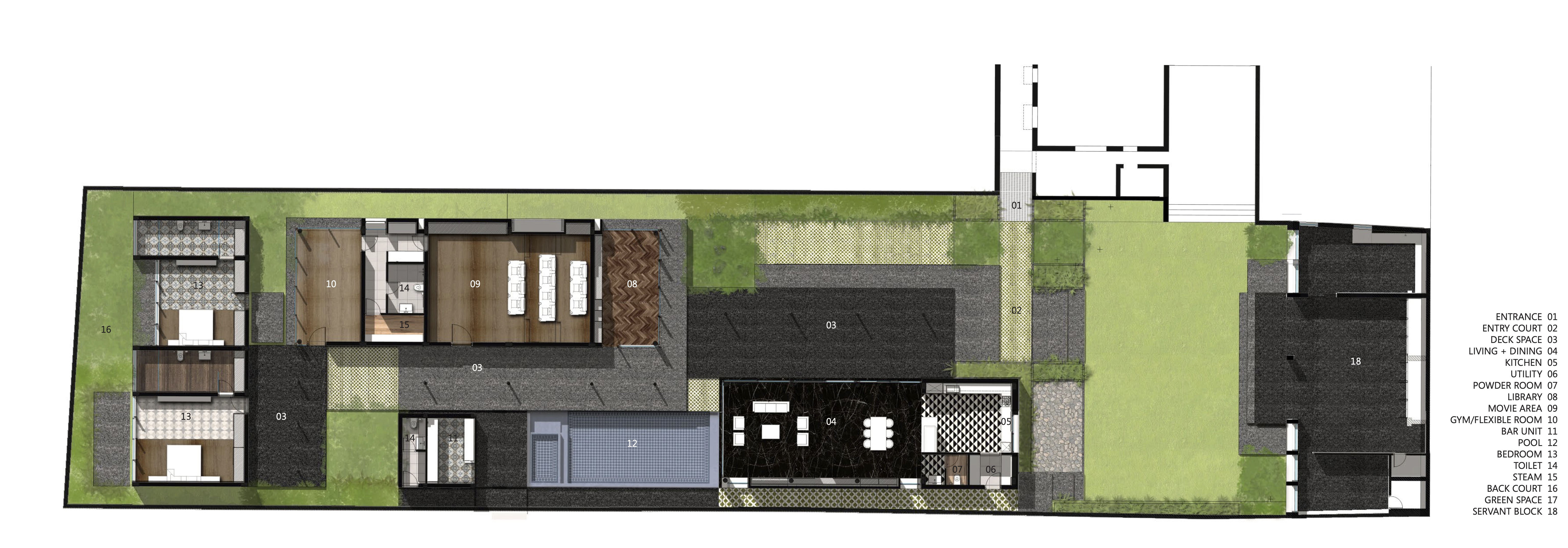 This extension house is situated in Thirupur in a L-shaped linear property adjacent to an already existing home. The space is a series of built and open spaces intertwined seamlessly giving the perfect blend of inside and outside as one moves through the connecting decks. The extended space is essentially divided into three zones - the first as you enter is the entrance court leading to the living, dining and kitchen that classifies as the public space. The second zone overlooking the pool is the movie room,gym and sauna that is the semi public space. The third quarter in the far end of the property are the sleeping spaces that are completely private and secluded backed up by a landscaped court. The three separate built spaces are connected by landscaped decks.